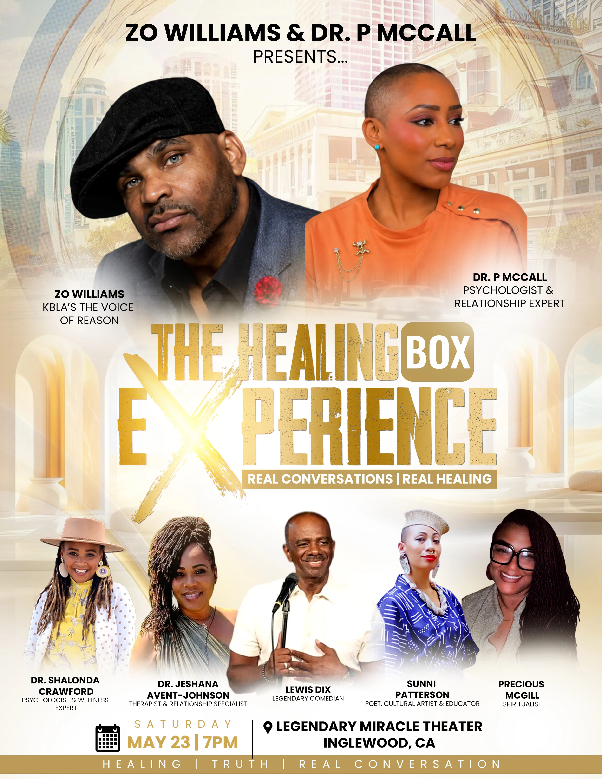 A unique ensemble of world, renowned, and respected talent starting with legendary Comedian, Lewis Dix, who brings the fun! Then we move to world, renown spoken word, artist, Sonni Pat Patterson., Who brings the contextual understanding with magical words. Then spiritualist Precious McGill gives multidimensional inner understanding and wisdom.